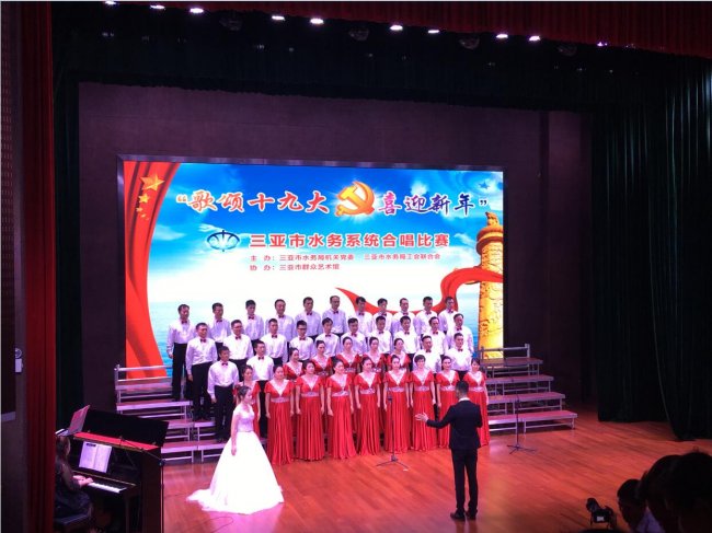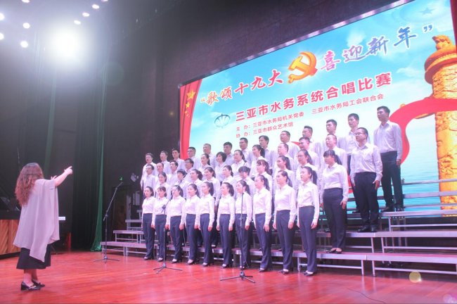 此次比賽,是為了慶祝黨的十九大勝利召開,迎接2018年元旦,唱響時(shí)代主旋律,弘揚(yáng)社會正能量,展現(xiàn)水務(wù)系統(tǒng)職工的精神面貌。針對此次比賽,我司特別邀請了三亞音樂家協(xié)會副主席、三亞愛樂合唱團(tuán)指揮王雙老師擔(dān)任此次專業(yè)指導(dǎo)和現(xiàn)場指揮。當(dāng)晚,水務(wù)系統(tǒng)共9支隊(duì)伍參加了比賽,整場演出喜慶熱烈,節(jié)目精彩紛呈。我司合唱團(tuán)演唱的第一首歌曲《祖國不會忘記》唱出了水業(yè)人不忘初心的精神氣質(zhì),表達(dá)了我們愛崗敬業(yè)、團(tuán)結(jié)奮進(jìn)的水業(yè)精神。第二首歌曲《在燦爛的陽光下》則抒發(fā)了我們愛黨、愛祖國的深厚情懷,合唱團(tuán)團(tuán)員們精神飽滿、充滿激情、意氣奮發(fā)、放聲歌唱,把對偉大祖國的熱愛,對黨的忠誠,對崇高理想的追求,都融入到深情的歌聲中。